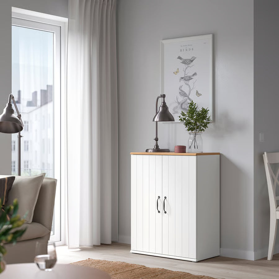 The SKRUVBY series has a traditional look with solitaire storage units that can be coordinated. This cabinet with grooved doors has a top panel with an oak expression to add a warm, natural feel to a room.